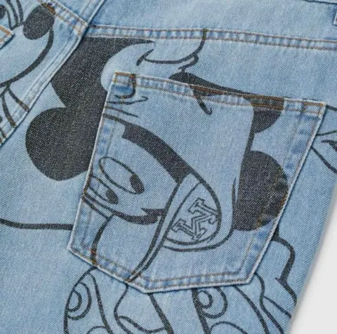 Pantalón Disney Mickey Mouse. Pantalón Disney, Mickey Mouse. Marca: H&M. Nuevo a estrenar con etiquetas. Jeans de cinco bolsillos al tobillo en demin lavado de algodón con diseño estampado. Modelo de corte holgado, talle alto, cierre de zíper y botón, y corte recto en las piernas.