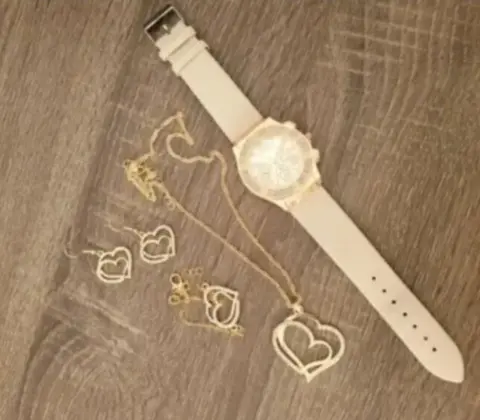 4-pcs Set de Relog y accessorios. 4-pcs Set de Relog y accessorios contiene 1. Pulcera de piedras, 1. Collar con dije con formas de corazon 1. Par de aretes con forma de corazon y un relog con exclusivo diseño en color dorado y negro ideal para ocasiones casuales o formales conbinalo con tus mejores atuendos para verte unica y atraer miradas