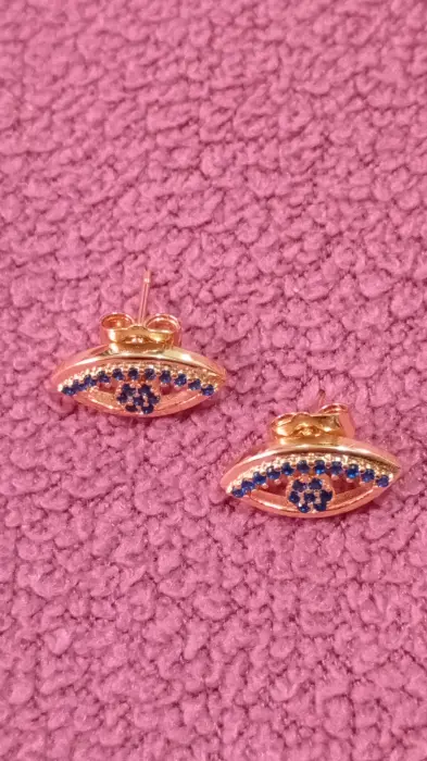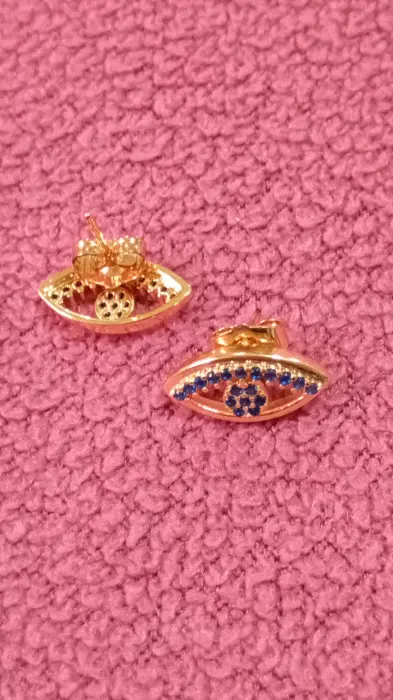 Aretes de oro laminado con forma de ojo. Tiene cristales azules en miniatura. Nuevos.