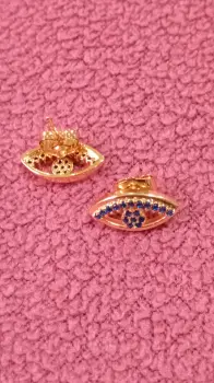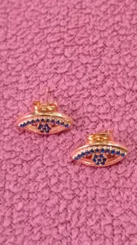 Aretes con forma de ojo en oro laminado. Aretes de oro laminado con forma de ojo. Tiene cristales azules en miniatura. Nuevos.