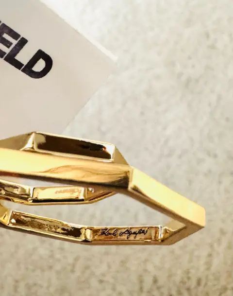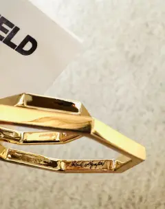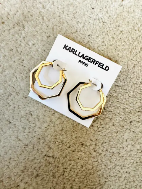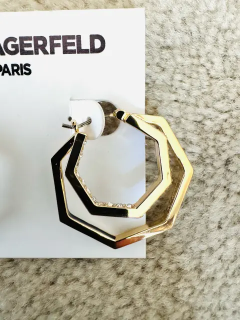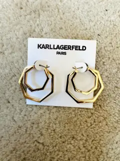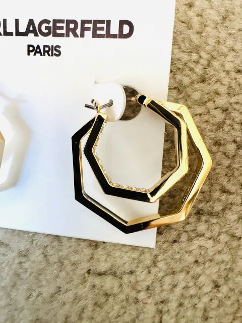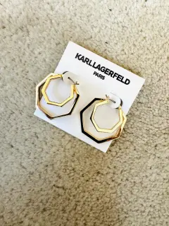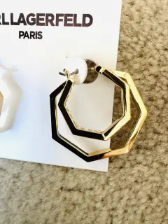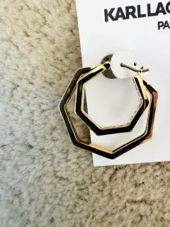 Ningún outfit está completo sin los accesorios adecuados! Del afamado diseñador Larl Lagerfeld que dura para Chanel y Fendi. Hermosos aretes en dos aros no circulares con brillos y con terminado el segundo en laqueado negro por dentro. Vienen con la firma del diseñador por dentro. En color dorado. Perfectos para un regalo o para lucirlos. De alta calidad. Más opciones en mi clóset. Ideales tempora