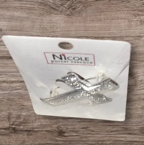 Broche cruz accento de piedras Nicole. Broche de Cruz con accento de piedras Nicole, con piedras blancas brillosas y otra pequeña cruz de acento en color plateado con cierre de precion, mide 5cm x 4cm, nuevo a estrenar con etiqueta en buen estado cosmetico.
