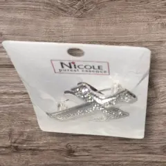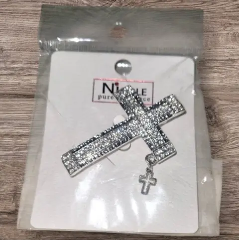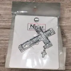 Broche de Cruz con accento de piedras Nicole, con piedras blancas brillosas y otra pequeña cruz de acento en color plateado con cierre de precion, mide 5cm x 4cm, nuevo a estrenar con etiqueta en buen estado cosmetico.