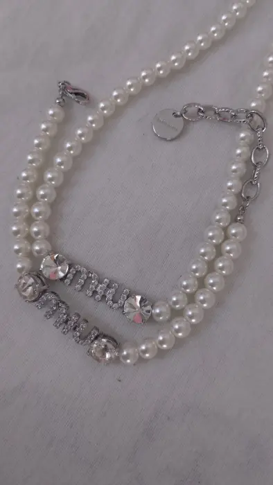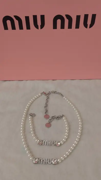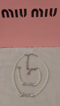 Collar y pulsera. Collar de perlas engarzadas con dije con cristales, mide 46 cm pulsera de perlas con dije acabado plateado mide 22 cm. No tengo la caja.