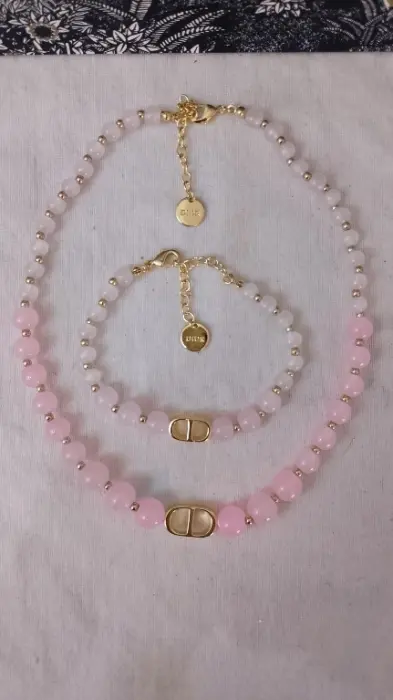 Collar y pulsera de perlas color rosa degradado, con cuentas doradas, con dije dorado, medida del collar 44 cm y la pulsera mide 22 cm.