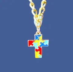 Dije de Autismo Awareness con cadena. Collar trenzado color dorado con Dije conciencia del Autismo en forma de cruz multicolor y broche de rosca, mide 34cm de largo con el dije, nuevo a estrenar.