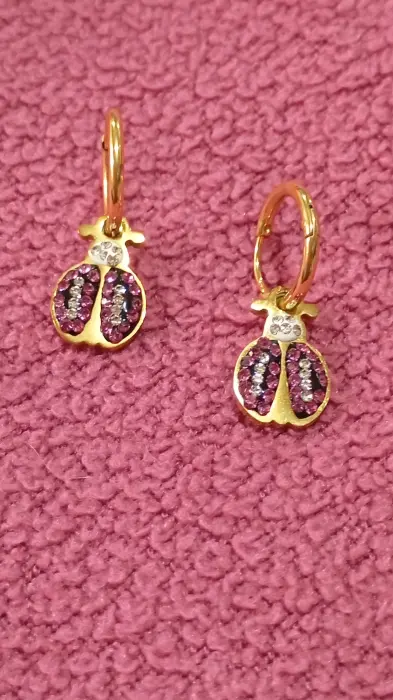 Huggies de mariquita color púrpura en oro laminado. Nuevos. Incluyen cajita.