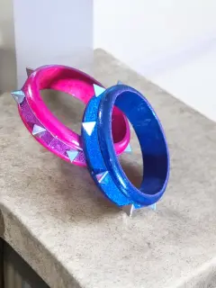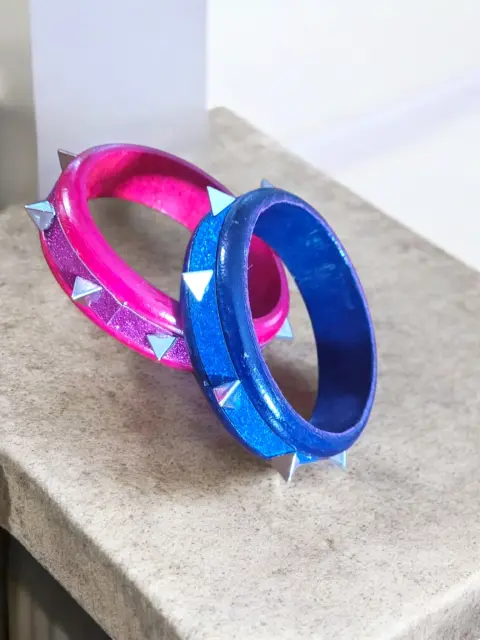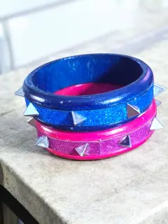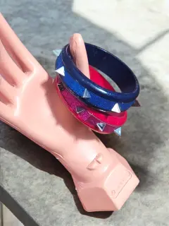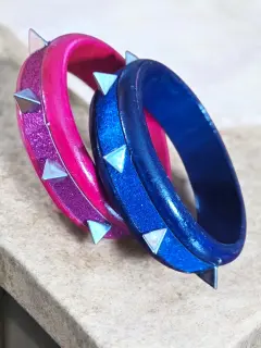Juego de 2-Piezas Pulceras Fashion Caryter, colores Rosa/rojo y azul/negro, con puntillas triangulares plateadas de acento, hechas de material plastico sintetico, miden 8cm de diametro, nuevas a estrenar con etiqueta en buen estado cosmetico.