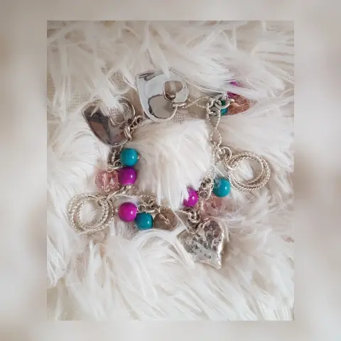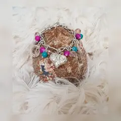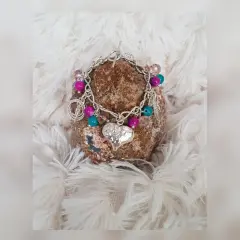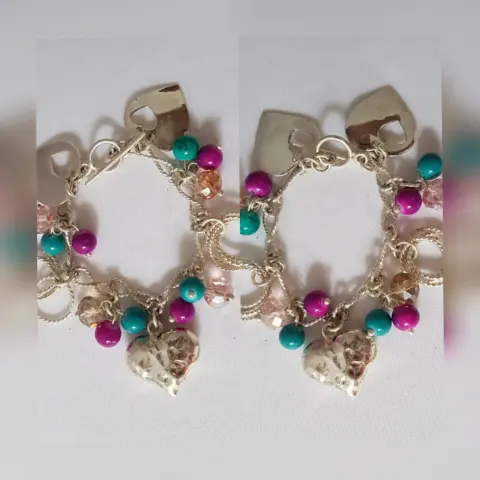 Pulsera eslabones infinito en alpaca tono plata c/dijes de corazón en alpaca tono plata, esferas bisutería multicolor y cierre p/gancho barra. Dimensiones cms: 16 largo.
