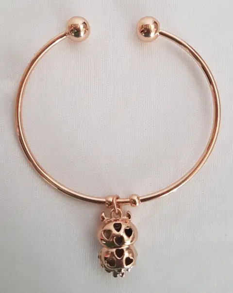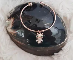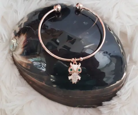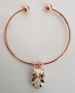 Pulsera en tono DORADO c/dije de búho c/aplique de circonía translúcida y verde esmeralda. Dimensiones. cms: 6 circunferencia. Aleación de zinc.