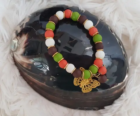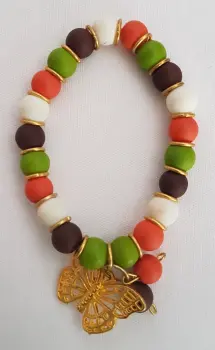 Pulsera autoajustable esferas acrílico MULTICOLOR en tonos BLANCO/TABACO/VERDE SECO/NARANJA, aros y dije mariposa en oro laminado. Dimensiones cms: 6 diámetro.***QUEDA A UNA MUÑECA DELGADA***
