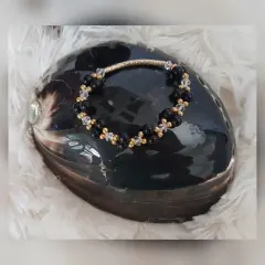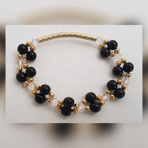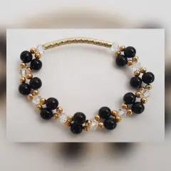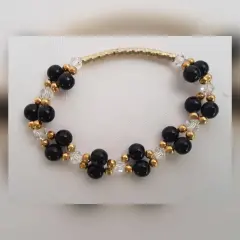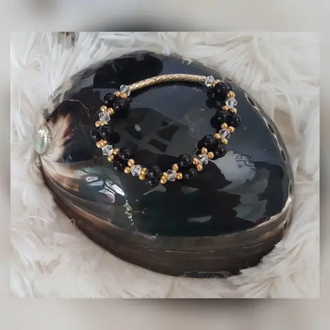 Pulsera Autoajustable c/tubo y esferas en oro laminado, perlas sintéticas tono NEGRO y cristal facetado translúcido. Dimensiones cms: 5 diámetro.***EL BRILLO DE LA PULSERA ES MUY BELLO Y NO LO CAPTA LA FOTOGRAFÍA***QUEDA A UNA MUÑECA DELGADA***