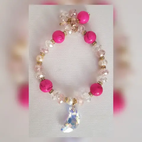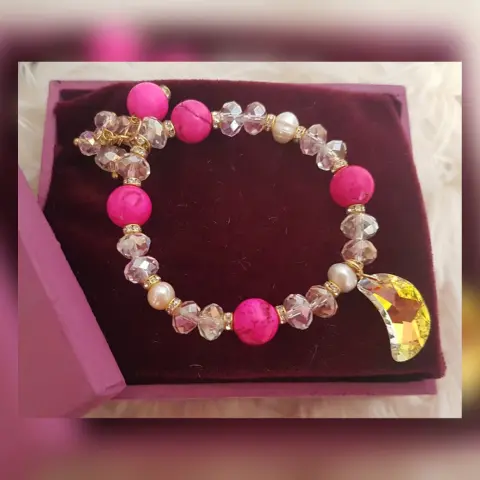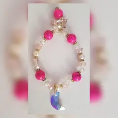 Pulsera Perla, Cristal, Piedra y Dije. Pulsera Autoajustable c/piedra sintética tono FUCSIA efecto marmoleado, cristal Facetado en color ROSA BEBÉ TORNASOL/TRANSLÚCIDO, perla de río sintética, rodel de pave c/circonias y dije luna en cristal checo tono TRANSLÚCIDO. Dimensiones cms: 5 diámetro.***EL BRILLO DE LA PULSERA ES MUY BELLO Y NO LO CAPTA LA FOTOGRAFÍA***QUEDA A UNA MUÑECA DELGADA******LA PULSERA SE ENTREGA SIN CAJA, ESTA SOLO ES UN ELEMENTO DECORATIVO***