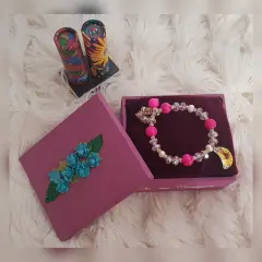 Pulsera Autoajustable c/piedra sintética tono FUCSIA efecto marmoleado, cristal Facetado en color ROSA BEBÉ TORNASOL/TRANSLÚCIDO, perla de río sintética, rodel de pave c/circonias y dije luna en cristal checo tono TRANSLÚCIDO. Dimensiones cms: 5 diámetro.***EL BRILLO DE LA PULSERA ES MUY BELLO Y NO LO CAPTA LA FOTOGRAFÍA***QUEDA A UNA MUÑECA DELGADA******LA PULSERA SE ENTREGA SIN CAJA, ESTA SOLO ES UN ELEMENTO DECORATIVO***