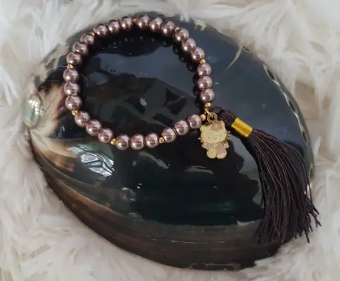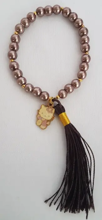 Pulsera Perla Sintética HK Tabaco. Pulsera autoajustable en perla sintética color TABACO, bolitas tono dorado, c/dije Hello Kitty y copete. Dimensiones cms: 7 circunferencia.