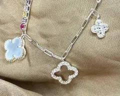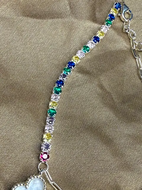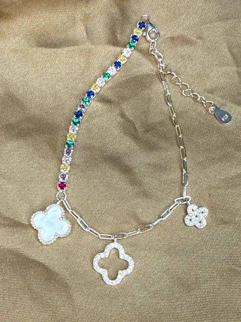 Pulsera trebol plata zirconias. Hermosa pulsera de plata con zirconias de colores, dije colgante de madre perla natural, mide 18cm mas extensión de 3cm. Tiene baño de rodio. Bellísima !!