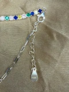 Hermosa pulsera de plata con zirconias de colores, dije colgante de madre perla natural, mide 18cm mas extensión de 3cm. Tiene baño de rodio. Bellísima !!