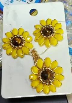 Bellos aretes y dije de alambrismo en forma de girasol, hechos con cristal facetado y piedra natural de ojo de tigre en color café y bola lisa en chapa de oro. Medidas de los aretes: 3 x 3 cm, medida de dije: 3 x 4.5 cm.