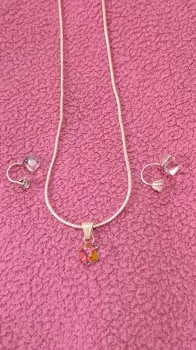 Set de aretes, dije y cadena en plata. Set de aretes, dije y cadena en plata. El dije y los aretes tienen cristales tornasol. Excelentes condiciones.