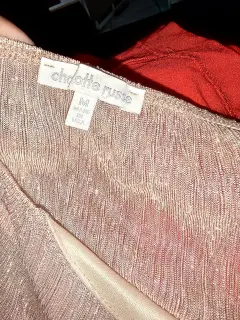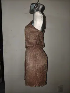 acabado brillante o metálico, que parece ser de color cobre, oro rosa o champán. El tejido tiene una textura plisada y un cordón