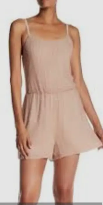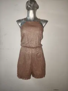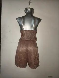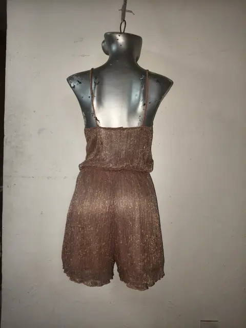 enterizo corto halter (romper). acabado brillante o metálico, que parece ser de color cobre, oro rosa o champán. El tejido tiene una textura plisada y un cordón