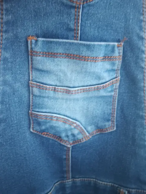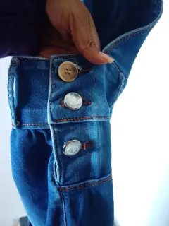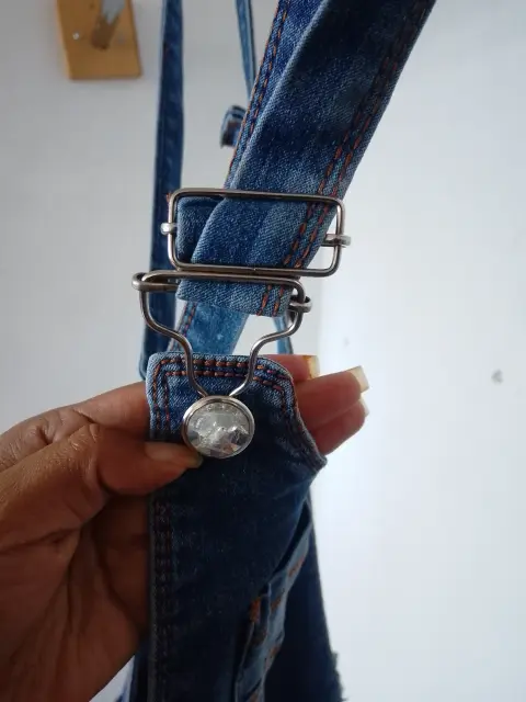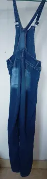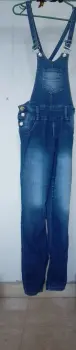 Jumper de mezclilla con botones de cristal. Pantalón largo 94 Ancho total72 Pecho largo 27 Tirantes largo total 59 se puede ajustar con los fierritos, recorrer o alargar, el largo total q alcanza es 54 Largo atrás 16.5 Detalles , un lado del pantalón no tiene un botón de cristal , le coloque un botón normal (foto)