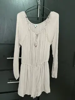 ¡Hermoso romper color malva/lavanda de Charlotte Russe! Estilo boho-chic ideal para un look fresco y femenino. ✨• Detalles: Encaje en hombros, escote ajustable con pompones y cintura elástica que favorece la figura.• Tela: Crepe ligero (textura corrugada), súper cómodo y ¡no necesita plancha!• Estado: Impecable, como nuevo. 👗Talla mediana