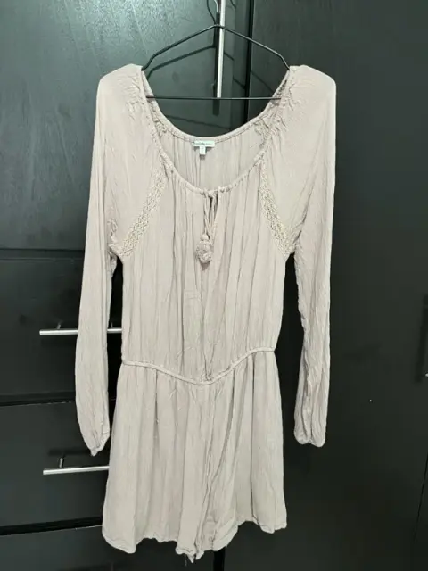 ¡Hermoso romper color malva/lavanda de Charlotte Russe! Estilo boho-chic ideal para un look fresco y femenino. ✨• Detalles: Encaje en hombros, escote ajustable con pompones y cintura elástica que favorece la figura.• Tela: Crepe ligero (textura corrugada), súper cómodo y ¡no necesita plancha!• Estado: Impecable, como nuevo. 👗Talla mediana