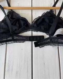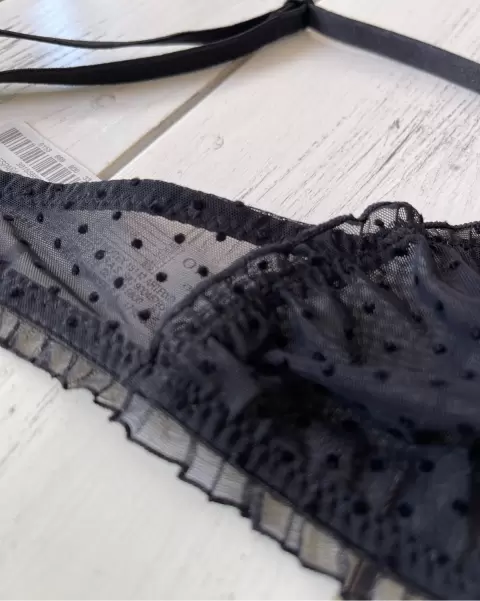 Bralette negro encaje con textura de bolitas.No tiene copas ni espacio para ponerlas.Talla: 32B Los tirantes son ajustables y tiene 4 medidas en el broche que cierra en la espalda. No tiene varillas. No tiene detalles.