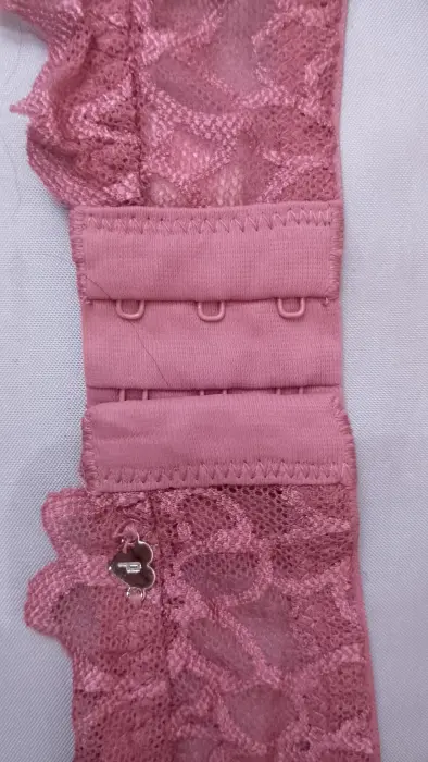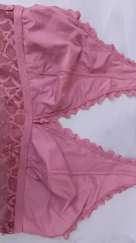 Brasier de encaje con forro color rosa claro con tirantes al cuello y broche en la espalda.
