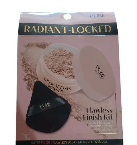 Kit para un maquillaje impecable "Radiant-Locked", de Pure Benefits. Incluye un polvo fijador y un aplicador.