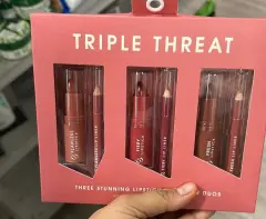 Este es un set de maquillaje llamado "Triple Threat" que incluye labiales y delineadores de labios. El set contiene tres dúos de labial y delineador de labios en diferentes tonos: Flawless, Fiery y Fresh. Cada dúo está diseñado para complementar el tono de piel y ofrecer un look completo para los labios.