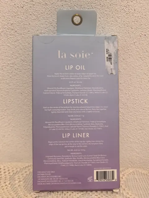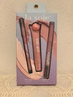 Este es un set de trío de labios de LA SOIE qué incluye delineador de labios, aceite de labios y lápiz labial.