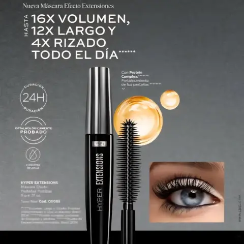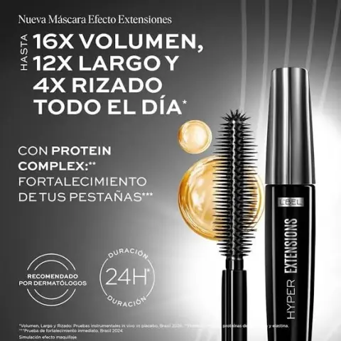 Mascara de pestañas Lbel. Máscara de Pestañas Hyper Extensions te brinda efecto extensiones, disfruta hasta 16 veces más de volumen, 12 veces más largor y 4 veces más rizado todo el día. Presentación 9g. (2.2 x 2 x 13.3 cm)