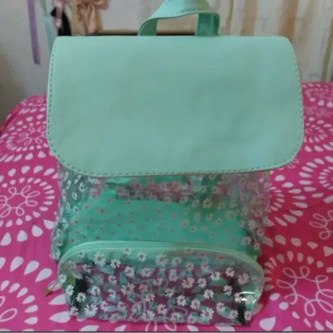 Preciosa mochila plastificada ,on detalles de glitter, esta padrisima!! 💚SUPER resistente ( Viene cocida) 💚Amplia 💚Práctica 💚Incluye cosmetiquera Medidas: ✨️27.5 cm Largo ✨️28 cm Ancho Cosmetiquera: 💚20 cm ancho 💚8 cm Largo