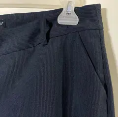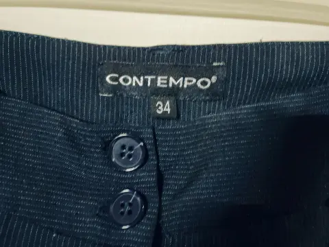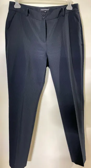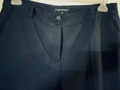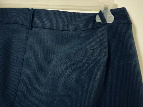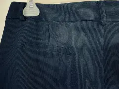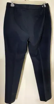 Pantalón de vestir azul marino delgado, entubado, con bolsas delanteras. SIN bolsas traseras, solo están marcadas, no son funcionales. Ancho de cintura 42cms Talla 34.