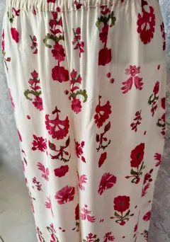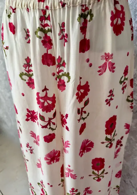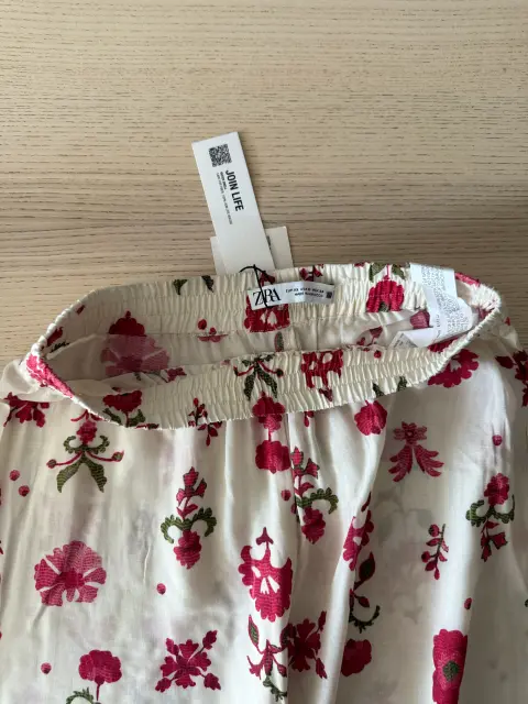PantalónZara, de la línea sostenible Join Life, diseño boho y fresco, ideal para climas cálidos o para looks relajados con estilo. Confeccionado en una tela ligera, corte recto y amplio, con pretina elástica que garantiza comodidad y ajuste. Prenda versátil que puede usarse con sandalias, alpargatas o incluso botas para un estilo más bohemio.