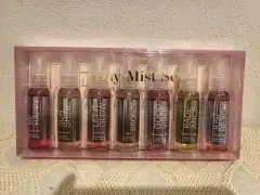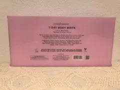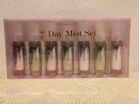 Set de fragancias 7 day body Mist de la marca simplepleasures.Lunes be happy con mi berries.Martes sunshine con cherry Kiss.Miércoles let it glow con strawberries.Jueves bronze con peach.Viernes good vibes con watermelon twist.Sábado radiante con vainilla coconut.Domingo Just be you con grapefruit.