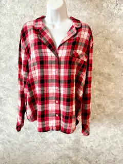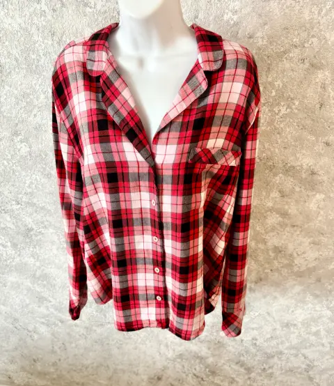 Camisa de pijama Victoria’s Secret. Camisa de pijama Victoria’s Secret Red Glam Flannel, estilo clásico, camisa tipo flannel en tonos rojo cereza, rosa empolvado y negro reinventa el concepto de comodidad con una silueta relajada, escote profundo y botones delicadamente femeninos. Su estampado tartán atemporal evoca los días fríos con un aire sofisticado.