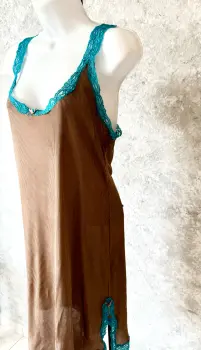 Camisón de seda de la exclusiva marca Mary GreenGreen, 100% seda natural, lo que lo hace increíblemente suave y ligero sobre la piel. elegante color café con delicado encaje turquesa. Ideal para noches especiales Marca reconocida por su lencería de lujo y ropa para dormir elaborada en seda, algodón de alta calidad y encajes finos. Mary Green es conocida como la “Reina de la Seda”