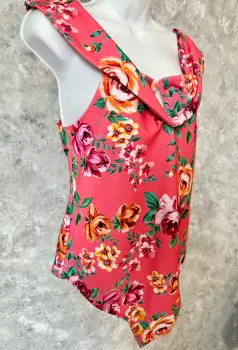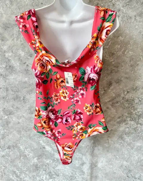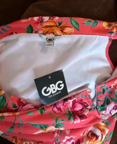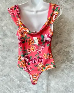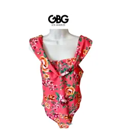 Body floral de GBG Los Ángeles. Body GBG Los Angeles (la línea joven de Guess) es una prenda ideal para destacar en cualquier ocasión. Estampado floral en tonos cálidos sobre fondo coral, combina un diseño atrevido con un toque romántico, escote drapeado en el pecho con abertura tipo gota, espalda baja y corte tipo panty, lo que lo hace perfecto para llevarlo con jeans, pantalones de vestir o faldas entalladas.