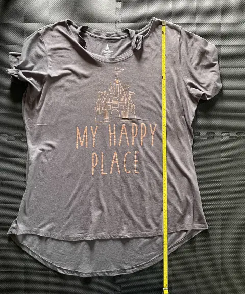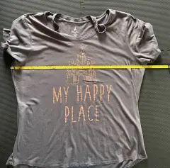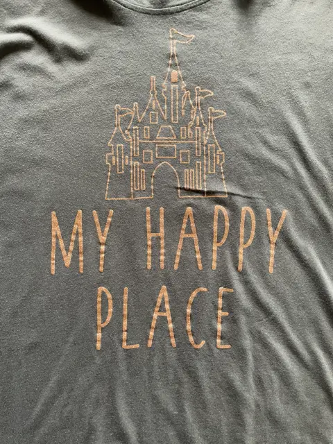 Disney Parks camiseta gris👩. Disney Parks original camiseta gris con castillo delineado y “My happy place” en cobre. Cuello redondo con tirante y manga corta. Más corta del frente y larga atrás. Super cómoda. Talla: 2XColor: grisMaterial: 63% algodón y 37% modal Cuidado: lavar en máquina Medidas: ancho de sisa a sisa: 62 cm, y largo desde hombro hasta abajo: 71 cm frente y 78 cm atrás