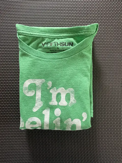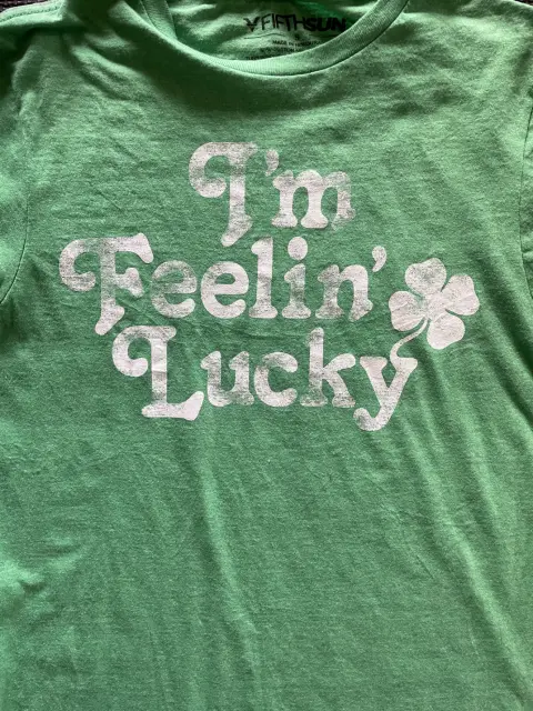 Fifth Sun camiseta verde 🍀 👩. Fifth Sun camiseta verde. De manga corta y cuello redondo. Con leyenda en blanco deslavado “I’m feeling lucky” y trébol. 🍀 Isela para todo tipo de actividades.Talla: SColor: verdeMaterial: 50% algodón y 50% poliéster Cuidado: lavar en máquina Medidas: ancho de sisa a sisa: 46 cm, y largo desde hombro hasta abajo: 66,5 cm