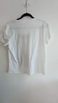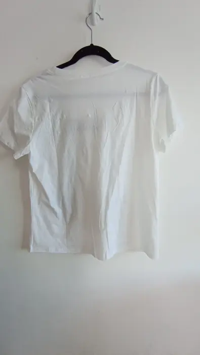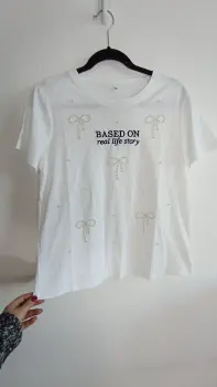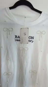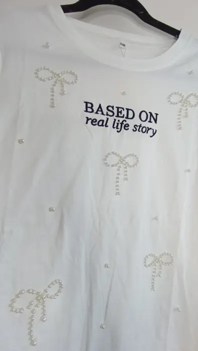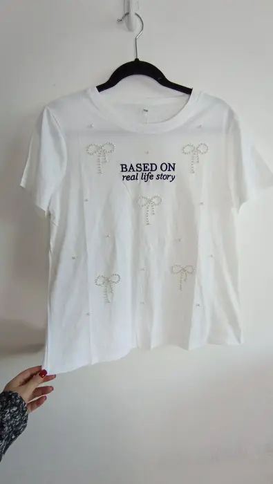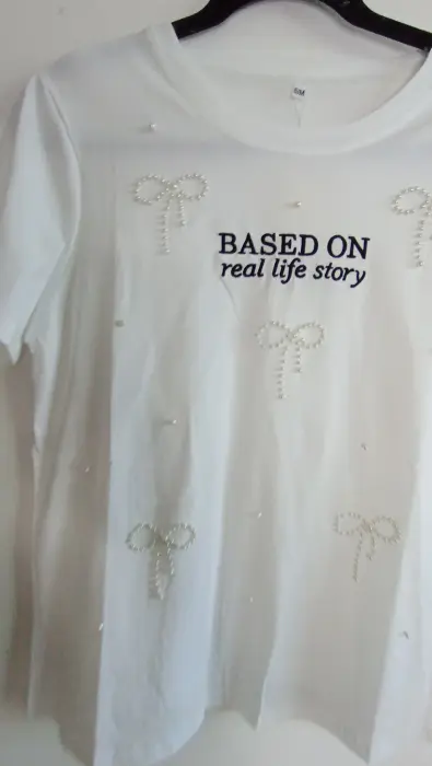 Playera blanca, detalle de perlas formando moños y las letras son bordadas. Nueva con etiqueta, talla S/M. Precio $200 pesos