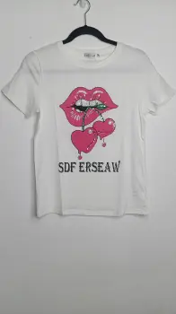 Playera blanca con estampado de labios, con brillos. Nueva con etiqueta. Marca YaoStar, talla S/M. Medidas aprox.39cm de hombros, 44cm de axila, 60cm de largo. Precio $200pesos