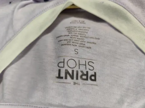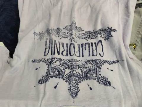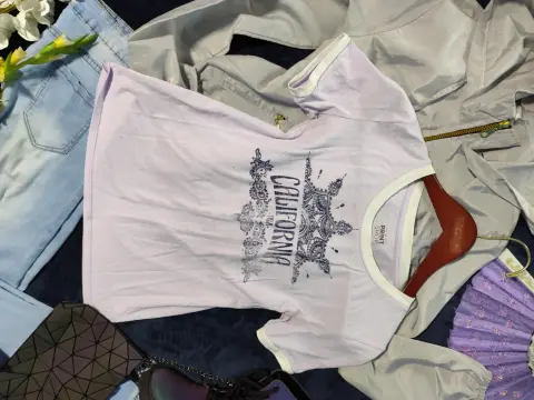 Playera Lila, contrastes blancos, manga corta, cuello redondo. Print al frente en tono azul marino "California" ligeramente borrado. Talla Ch.