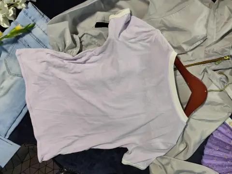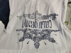 Playera California (Lila&Blanco). Playera Lila, contrastes blancos, manga corta, cuello redondo. Print al frente en tono azul marino "California" ligeramente borrado. Talla Ch.