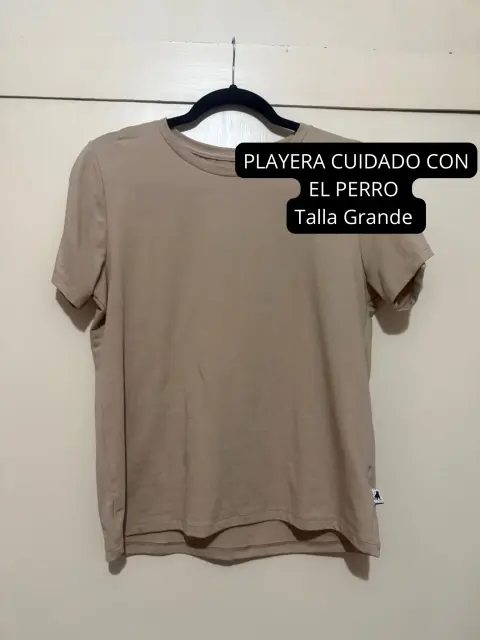 Playera cuidado con el perro talla L. Toda la ropa vendida se manda lavadita, lista para que la puedas usar. También te puedo hacer paquetes de más prendas para que aproveches el envío. Cualquier duda que tengas no dudes en escribirme. Las medidas son tomadas de la parte del pecho de axila a axila y del largo que queda la playera La verdad no la usé me quedó pequeña