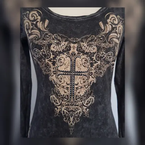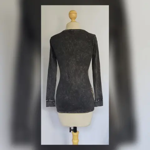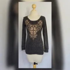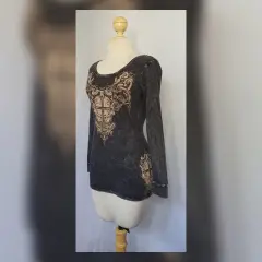 Playera estilo Crew Sweatshirt en color NEGRO ÉBANO DEGRADADO modelo "Ornella" con estampado delantero y lateral en tono ORO ENVEJECIDO y aplique bisutería translúcida, cuello redondo y manga larga. Por la composición de la tela es stretch. Talla M. Dimensiones cms: 37.5 hombro, 46.5 axila, 37.5 cintura, 46 zona baja, 64.5 largo, 59.5 largo manga. 100% algodón. P/lavado en casa.***Esta marca maneja prendas de extraordinaria calidad, su algodón es orgánico y soporta ciclos de lavado en máquina sin problemas, no se deslavan los estampados y las telas salen casi sin arrugas.***EL EFECTO DEGRADADO DE LA PRENDA ES MUY BELLO***