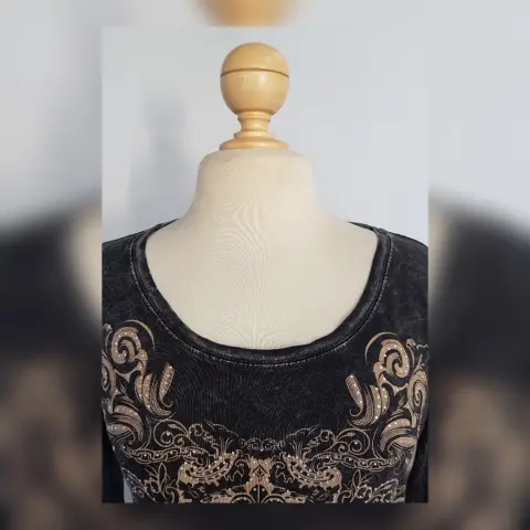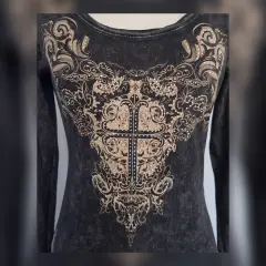 Playera estilo Crew Sweatshirt mod Ornella. Playera estilo Crew Sweatshirt en color NEGRO ÉBANO DEGRADADO modelo "Ornella" con estampado delantero y lateral en tono ORO ENVEJECIDO y aplique bisutería translúcida, cuello redondo y manga larga. Por la composición de la tela es stretch. Talla M. Dimensiones cms: 37.5 hombro, 46.5 axila, 37.5 cintura, 46 zona baja, 64.5 largo, 59.5 largo manga. 100% algodón. P/lavado en casa.***Esta marca maneja prendas de extraordinaria calidad, su algodón es orgánico y soporta ciclos de lavado en máquina sin problemas, no se deslavan los estampados y las telas salen casi sin arrugas.***EL EFECTO DEGRADADO DE LA PRENDA ES MUY BELLO***